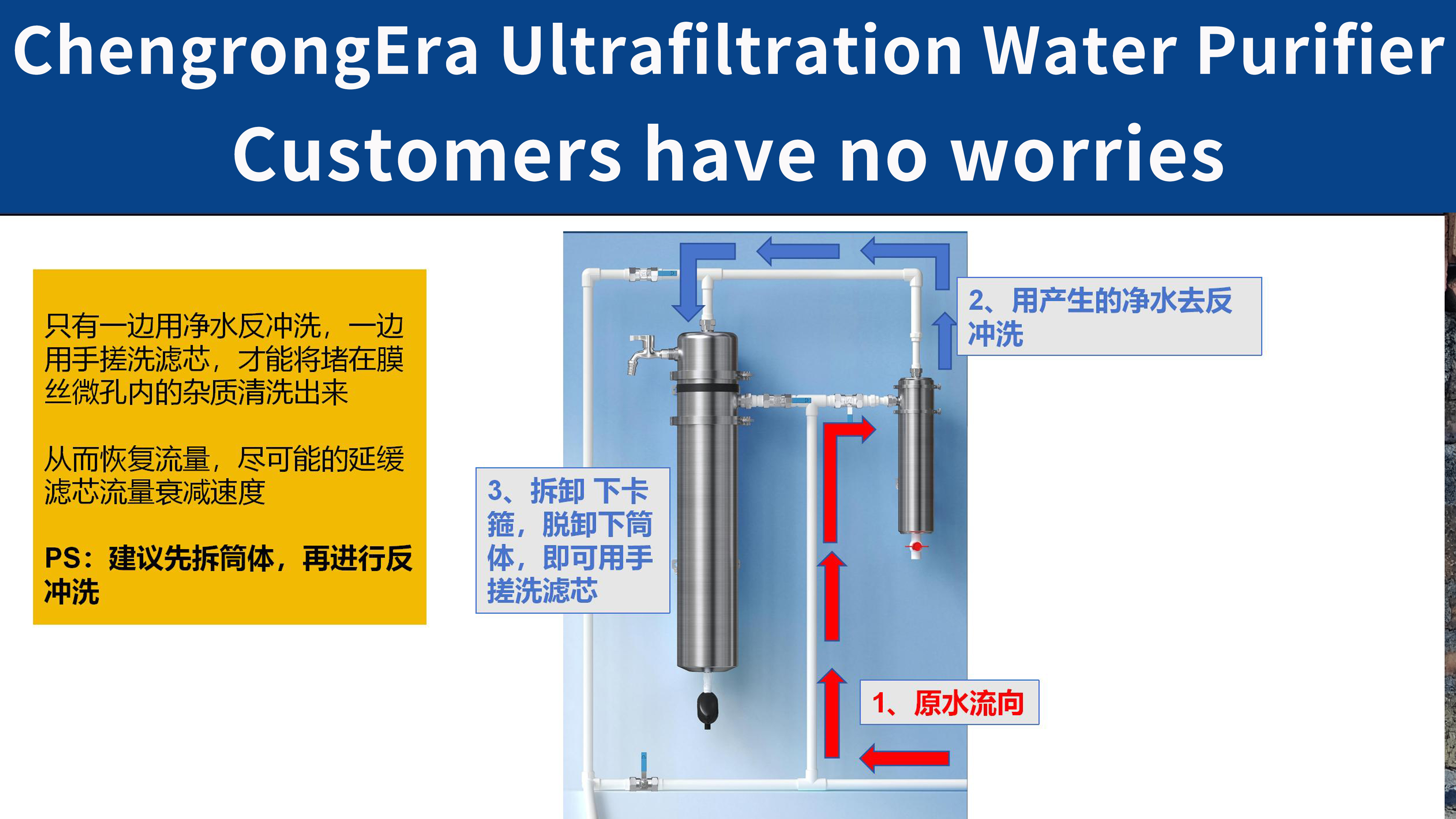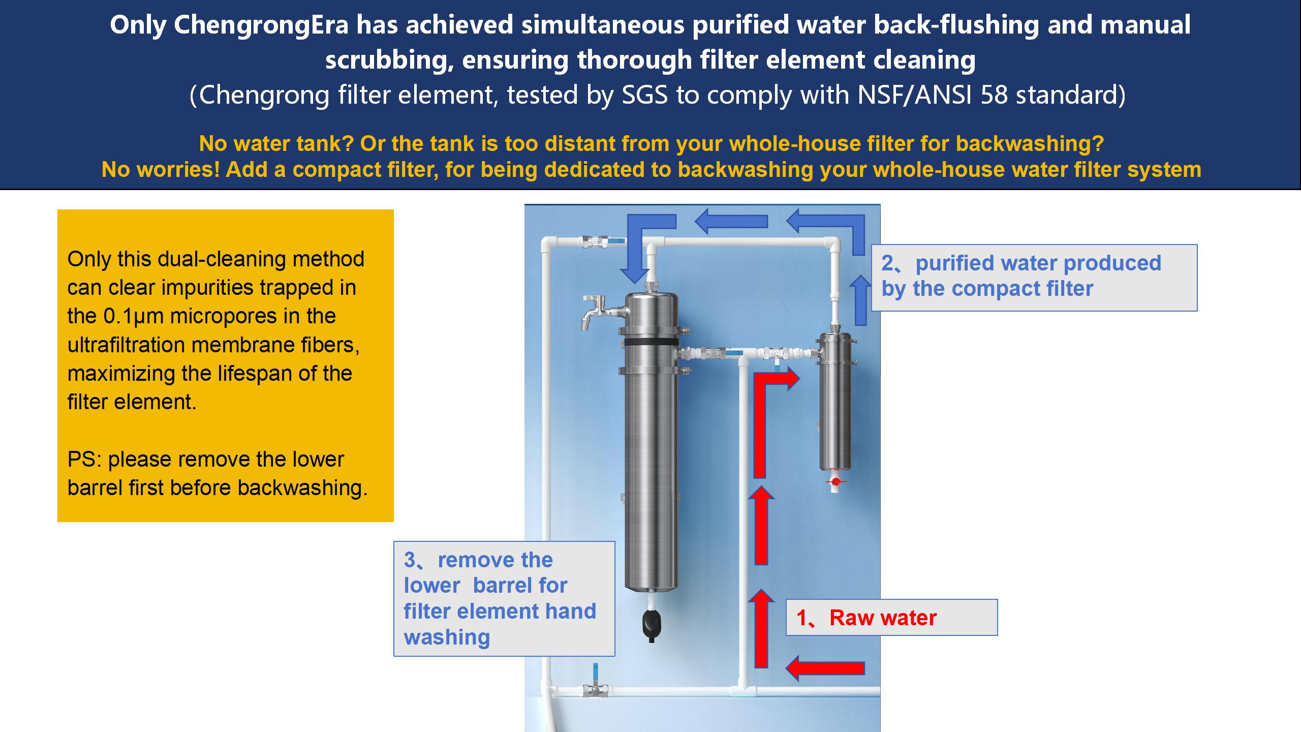 It wasn't until the client fully understood the product functions and structure design through our communication that the customer truly recognized the scientific design of ChengrongEra 0.1μm pipeline ultra-filtration water filters. Therefore, I took some time today to create a few simple schematic diagrams. By the way, I also wanna share the key information from these days' communications content with everyone here for reference and personal documentation.